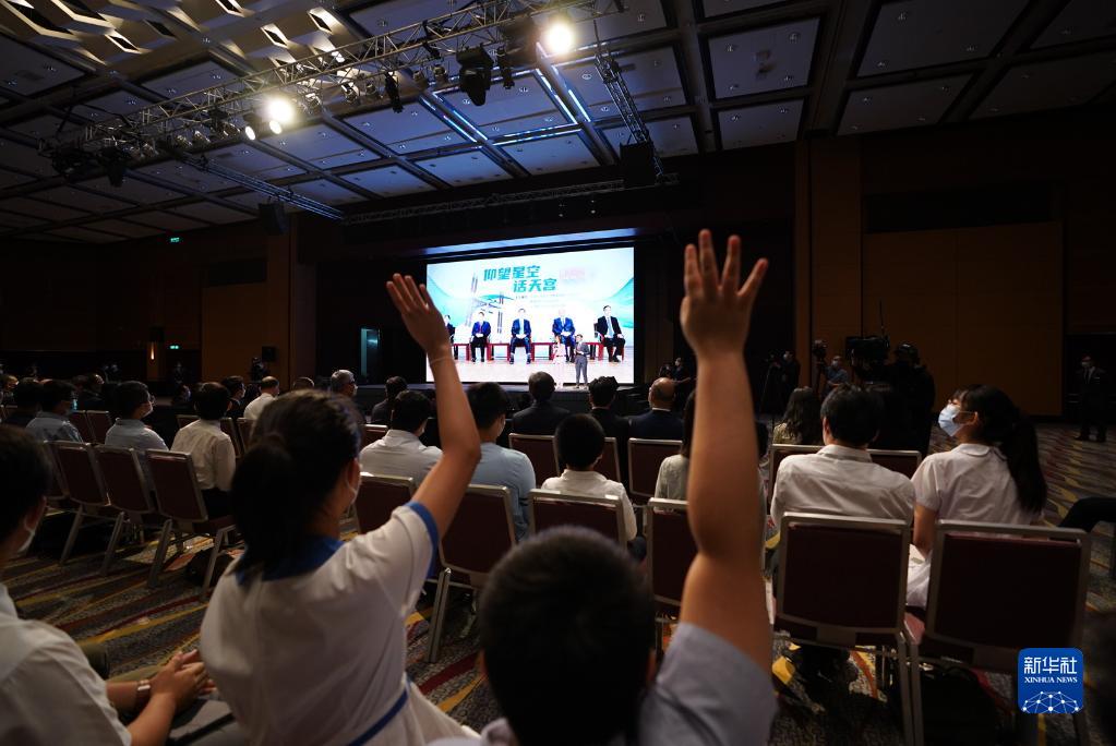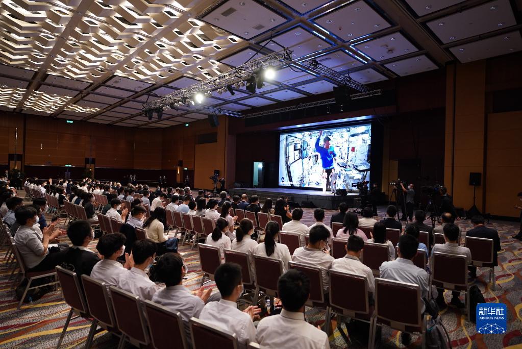 9月3日,正在天宮空間站執行任務的神舟十二號乘組與香港科技工作者、教師和大中學生進行天地連線互動。新華社記者 呂小煒 攝