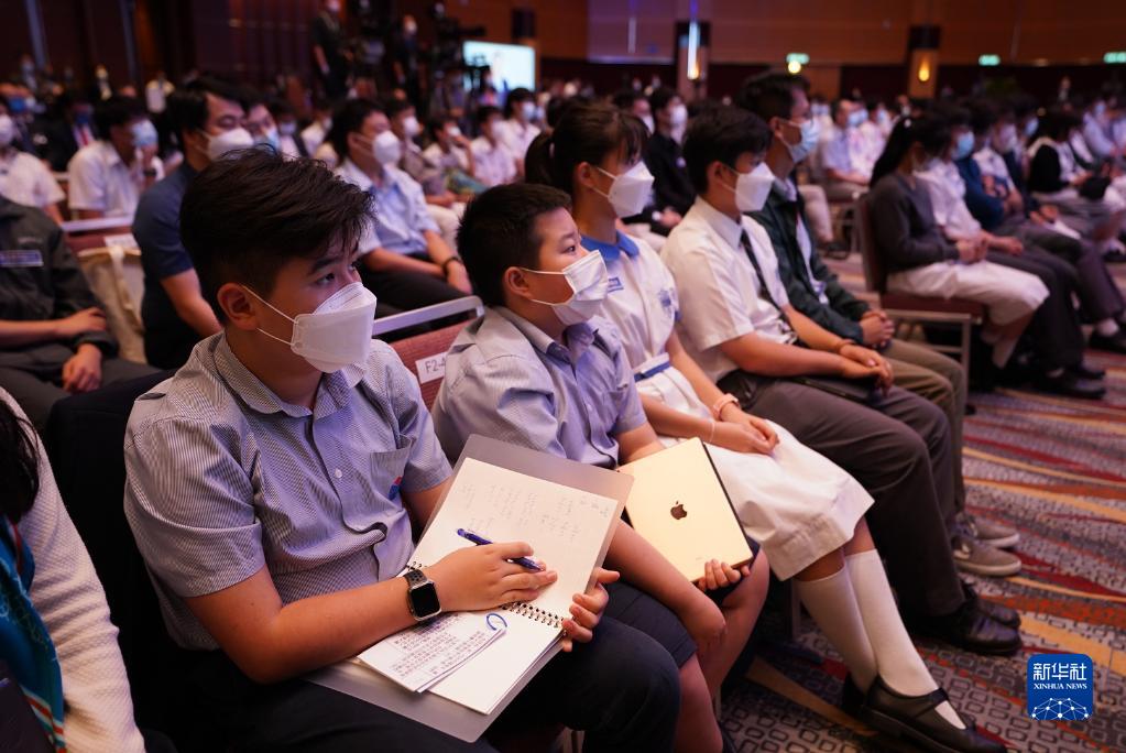 9月3日,在香港會場,香港青年學生代表向北京航天專家連線提問。新華社記者 呂小煒 攝