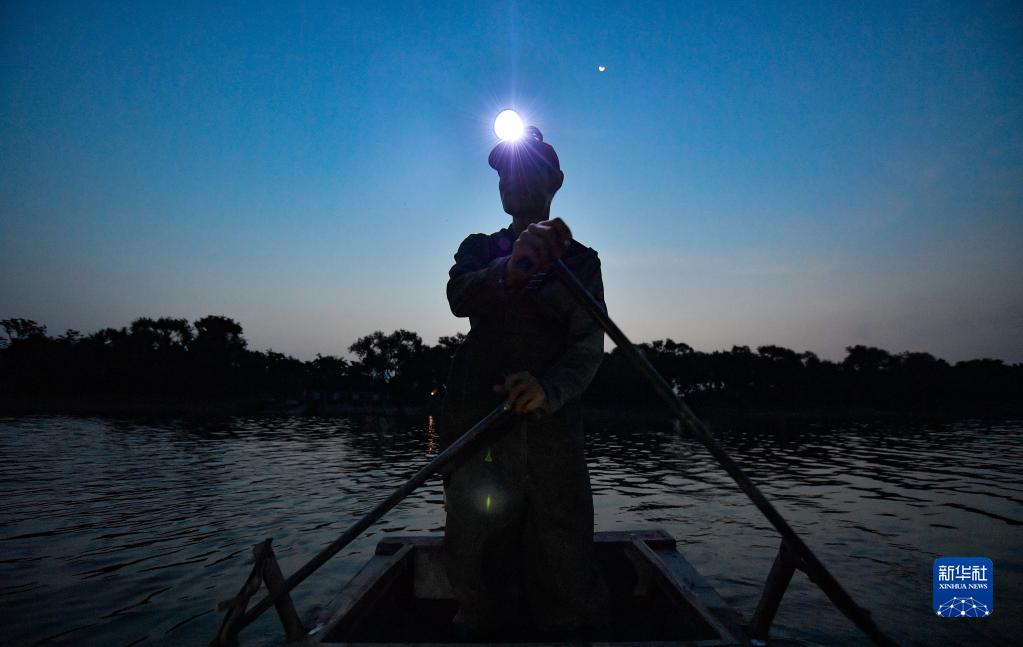 清晨,小辛碼頭村村民在潮白河上捕魚,為該村農(nóng)家院提供菜品原料(9月3日攝)。新華社記者 孫凡越 攝