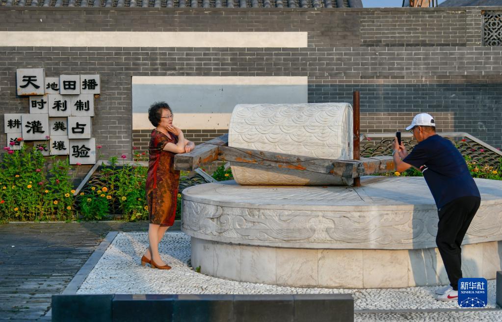 游客在天津市寶坻區(qū)黃莊鎮(zhèn)小辛碼頭村的水稻文化園拍照(9月3日攝)。新華社記者 孫凡越 攝