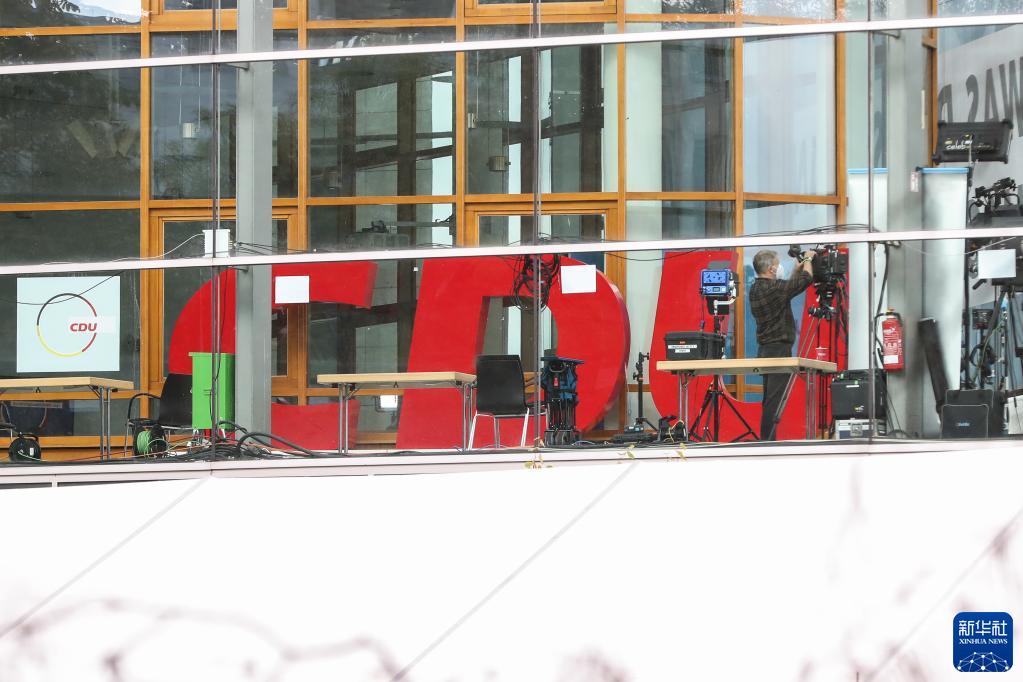 9月25日,一名媒體工作人員在德國首都柏林的德國基督教民主聯盟(基民盟)總部內進行準備工作。