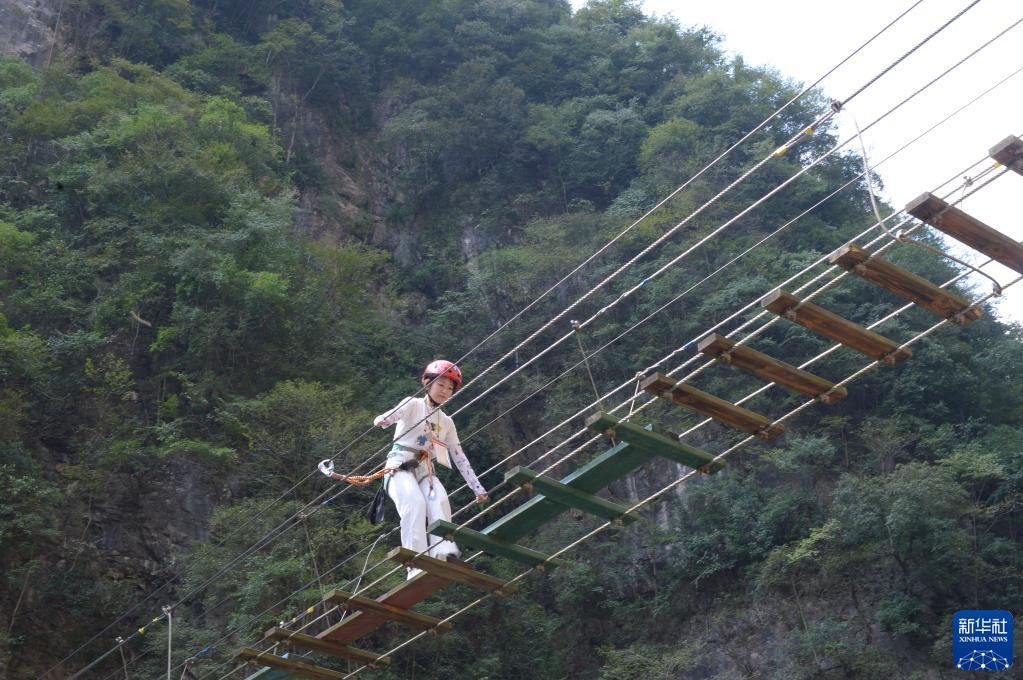 10月2日,在貴陽市開陽縣南江大峽谷,游客在安全措施的保護下體驗過天梯。