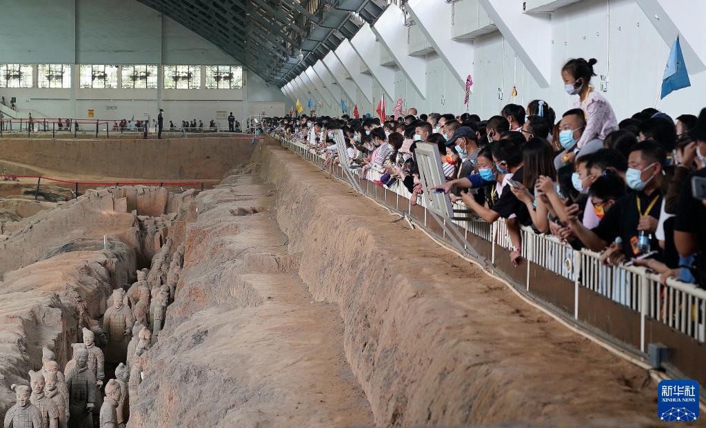 10月2日,游客在陜西西安秦始皇兵馬俑博物館參觀。
