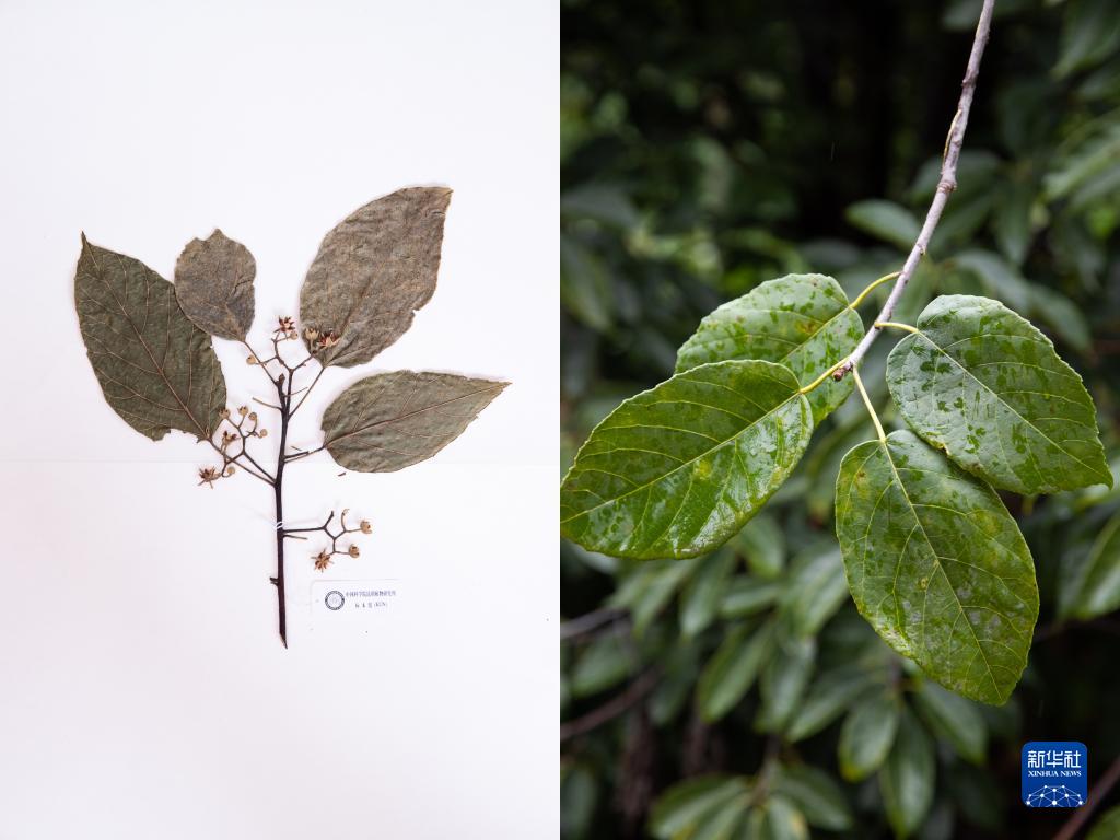 這是10月10日在昆明植物園拍攝的滇桐。這張拼版照片分別為科研人員野外采集的標本(左)和在植物園遷地保護后存活下來的同種植物。