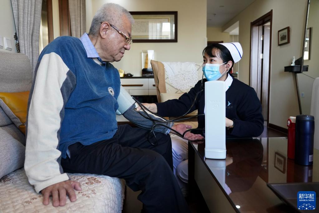 10月11日,在位于河北燕郊的燕達金色年華健康養(yǎng)護中心居家式養(yǎng)老公寓里,護士上門給呂偉業(yè)(左)測血壓。