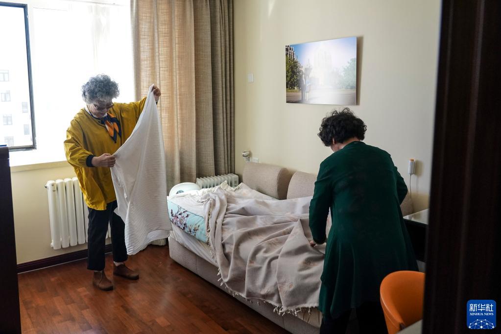 10月11日,在位于河北燕郊的燕達金色年華健康養護中心居家式養老公寓里,李戰平(左)和家政阿姨一起收拾房間。