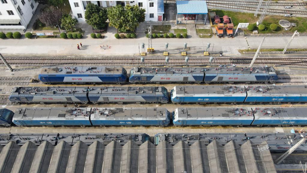 這是11月23日拍攝的停靠在成都機(jī)務(wù)段的中歐班列編組和諧型機(jī)車頭(無(wú)人機(jī)照片)。新華社記者胥冰潔攝
