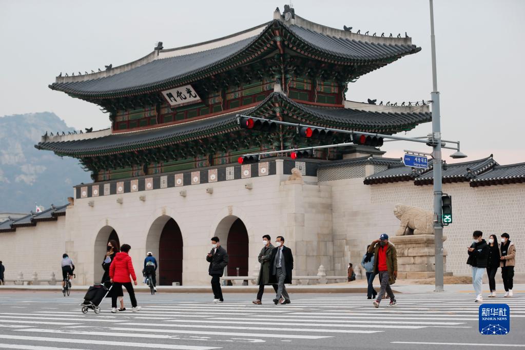 11月29日,行人佩戴口罩在韓國首爾光化門過馬路。新華社記者 王益亮 攝