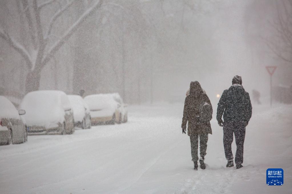 12月1日,行人在拉脫維亞里加的雪中行走。