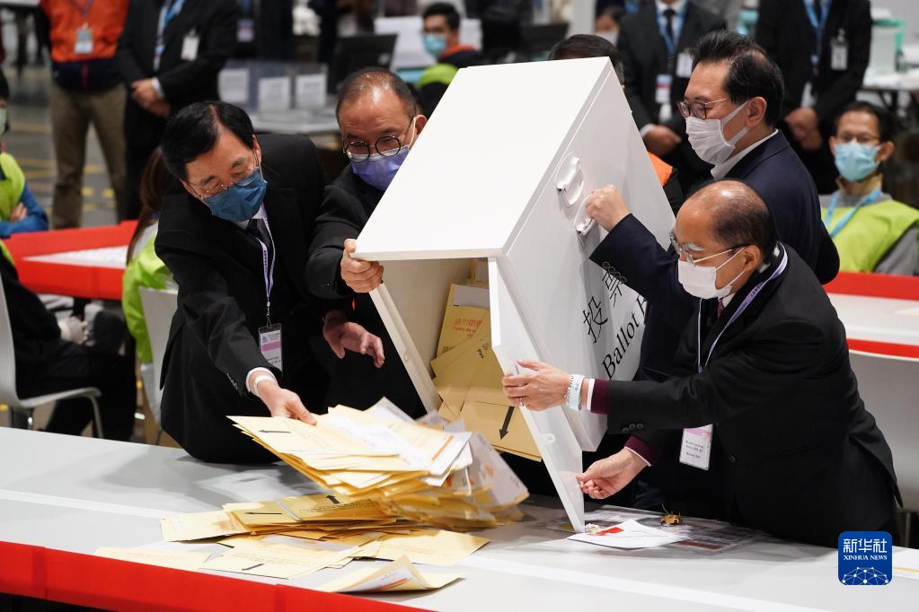 12月19日,香港特區選舉管理委員會主席馮驊(右二)打開票箱。新華社記者 呂小煒 攝
