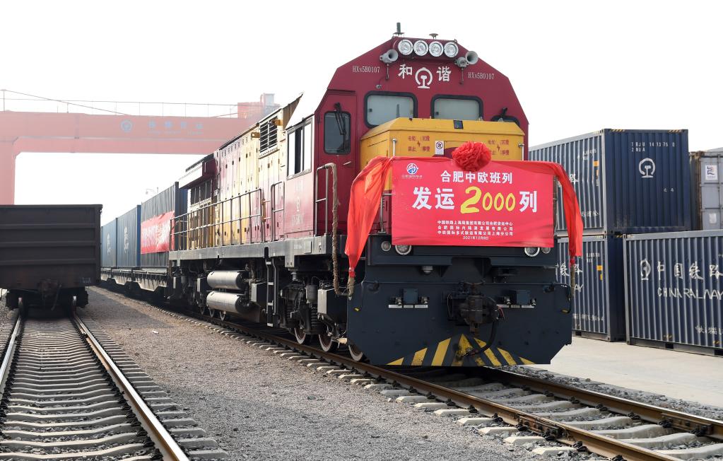 12月8日,在合肥北站物流基地,第2000列合肥中歐班列即將啟程。(新華社記者周牧攝)