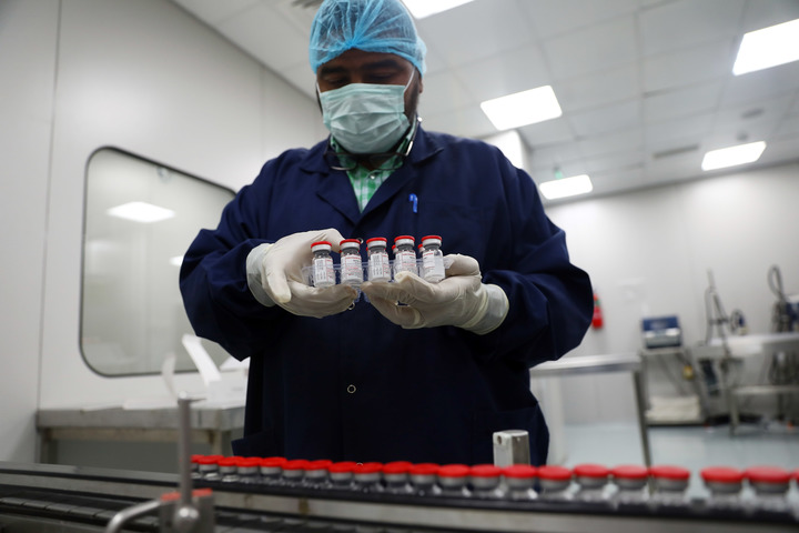 在埃及吉薩的埃及生物制品與疫苗公司疫苗生產廠,工作人員對貼標的新冠疫苗進行裝盒前準備(2021年9月6日)。新華社發(艾哈邁德·戈馬攝)