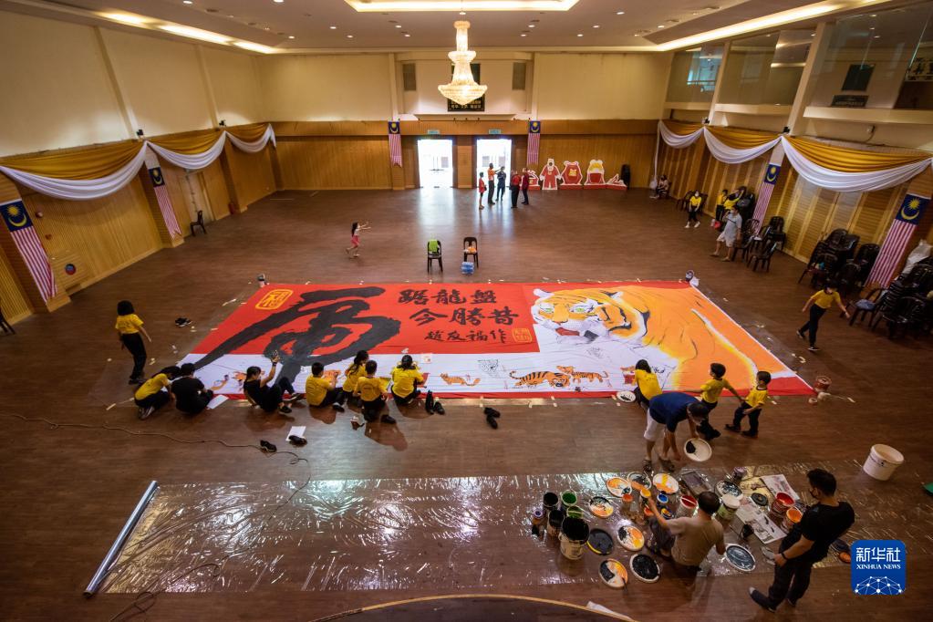 為迎接農歷虎年的到來,文冬當地一家華人團體邀請畫家和學生一起創作了一幅11.5米長、4.5米寬的老虎年畫。新華社發(張紋綜攝)
