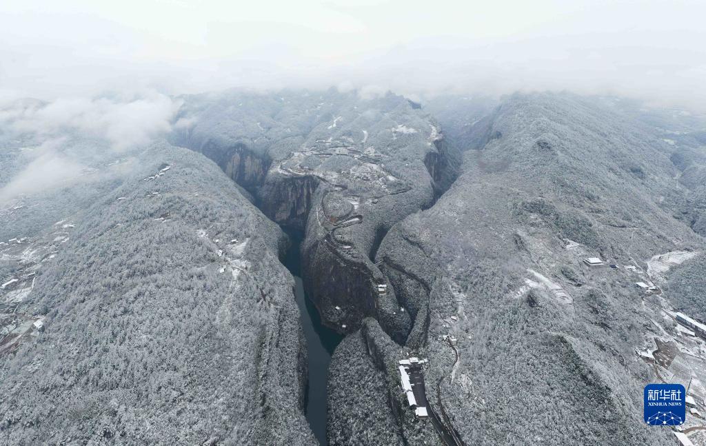 12月27日在湖北省鶴峰縣容美鎮屏山村拍攝的雪景(無人機照片)。