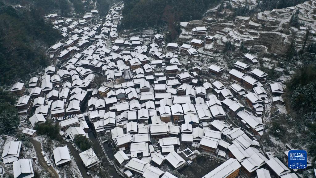 12月27日在貴州省榕江縣栽麻鎮拍攝的雪景(無人機照片)。