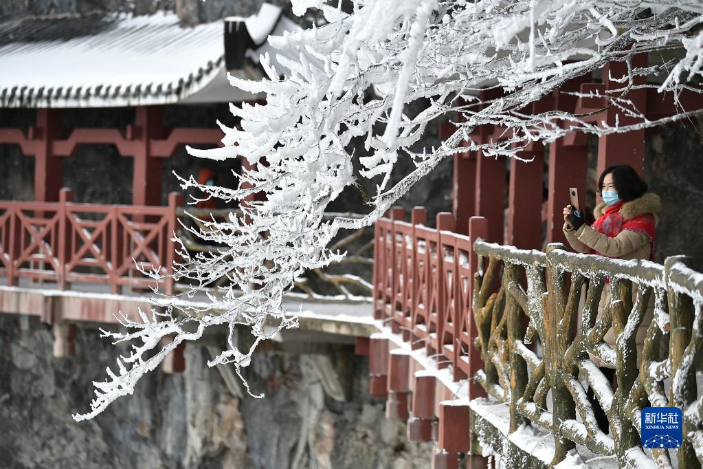12月27日,游客在湖南省張家界天門山景區拍攝雪后美景。