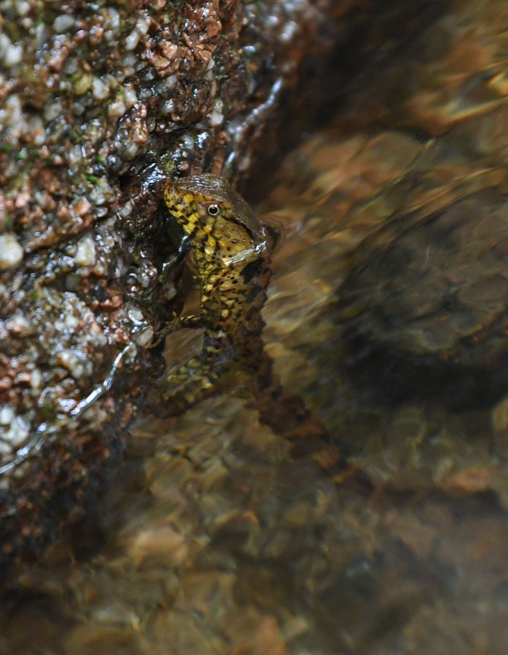 沿著隱藏在深山密林中一條叫作“廟背沖”的小溪溝上行三四百米,在科研人員的指引下,我們幸運地見到了兩只野生鱷蜥,其中一只還是去年出生的亞成體。