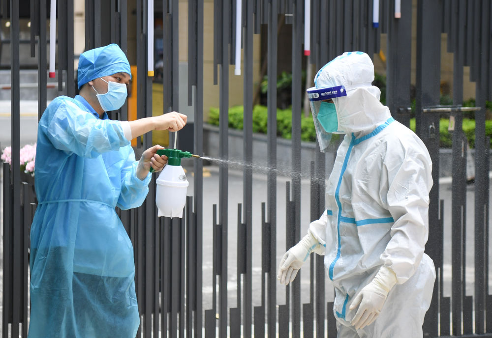 ↑2021年5月27日,在廣州荔灣區白鶴洞街道一小區檢測點,荔灣區骨傷科醫院的醫護人員給換班下來的同事噴灑消毒液。