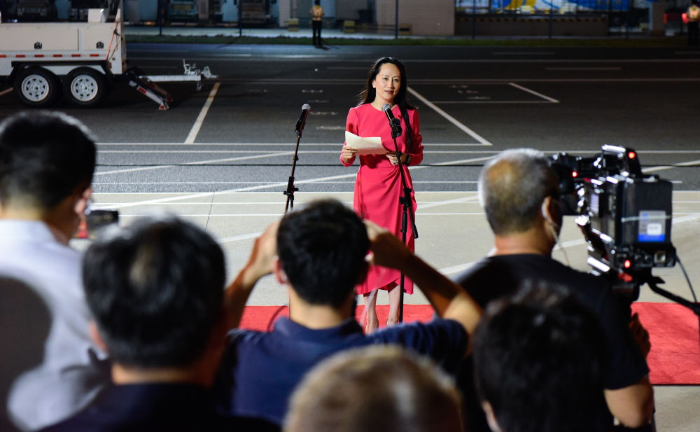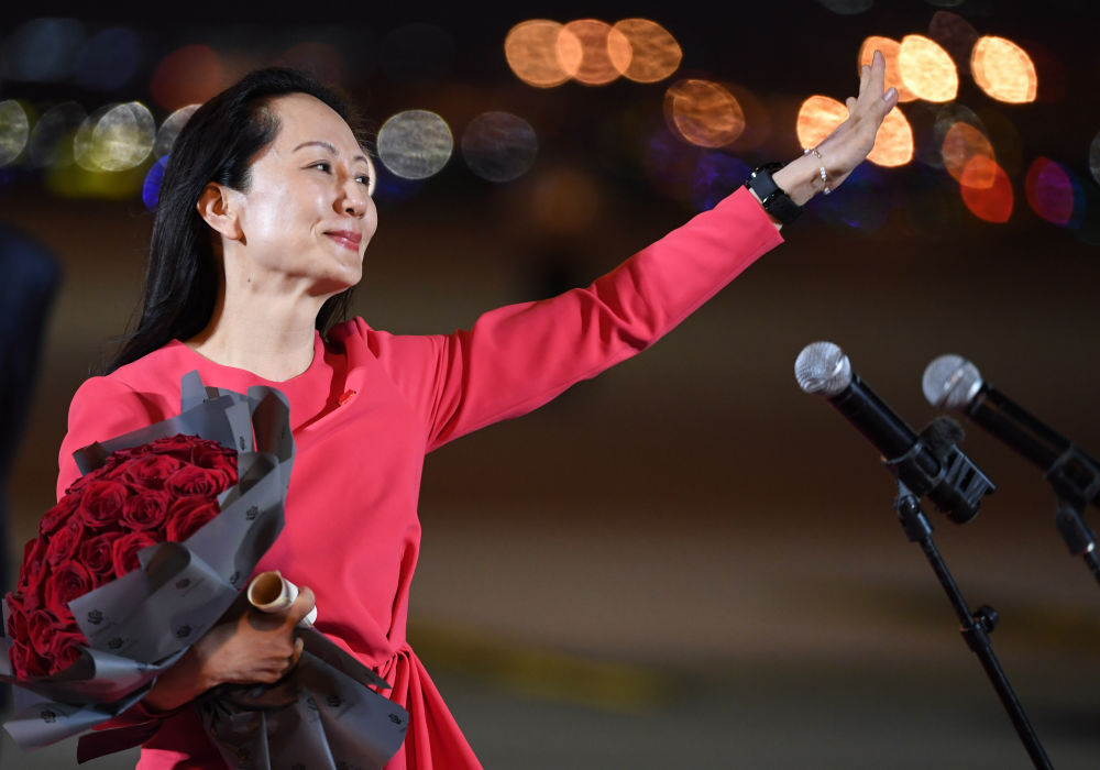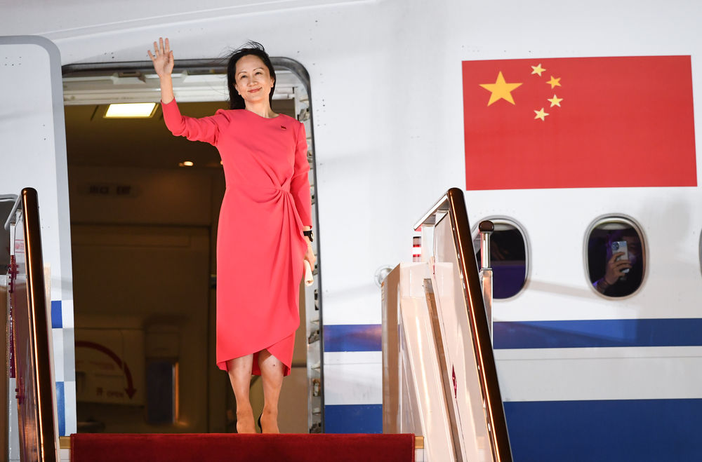 ↑2021年9月25日晚,在黨和人民親切關懷和堅定支持下,孟晚舟在結束被加拿大方面近3年的非法拘押后,乘坐中國政府包機抵達深圳寶安國際機場,順利回到祖國。