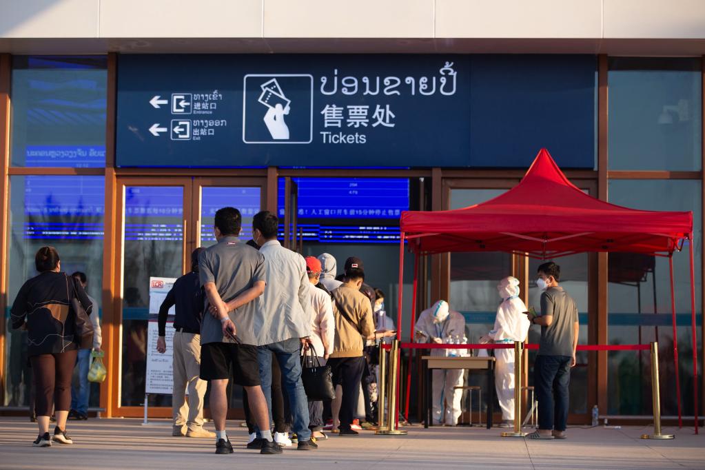 2021年12月12日,旅客在中老鐵路萬象站排隊買票。(新華社記者章建華攝)