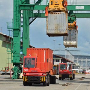 這是2022年1月1日拍攝的正在進行集裝箱裝卸作業的文萊摩拉港碼頭。(新華社發,杰弗里·黃攝)