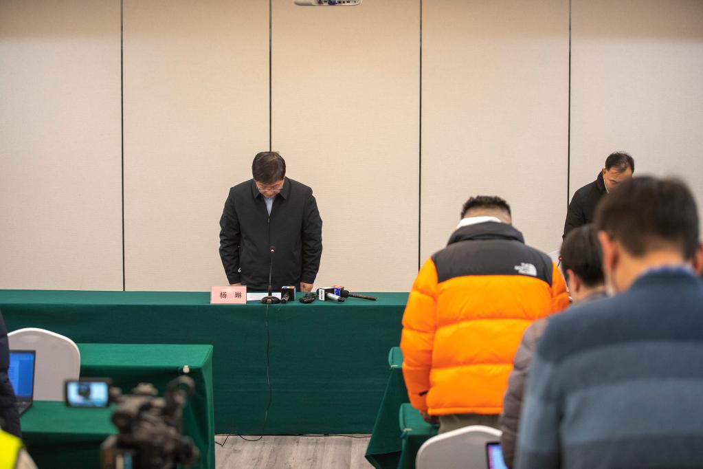 1月8日凌晨,在重慶市武隆區食堂坍塌事故新聞通氣會上,與會者為事故遇難者默哀。新華社記者 黃偉 攝