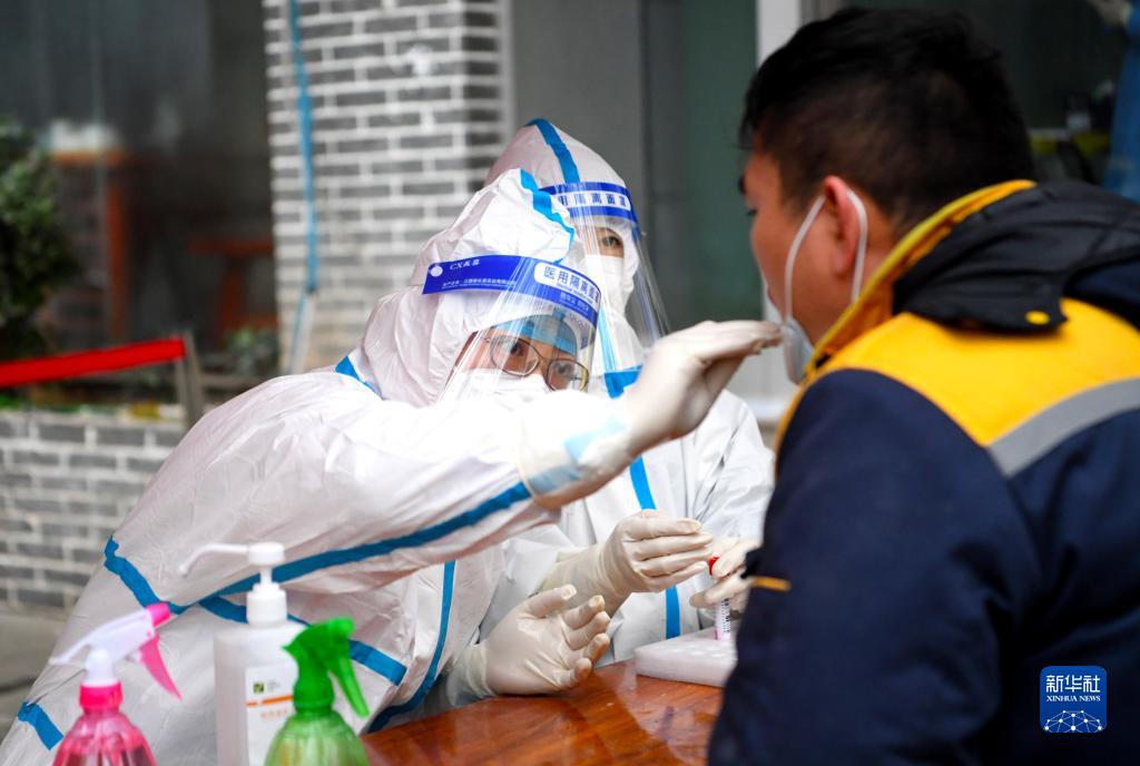 1月10日,在鄭州市緯一路一核酸檢測點,市民在接受核酸檢測取樣。