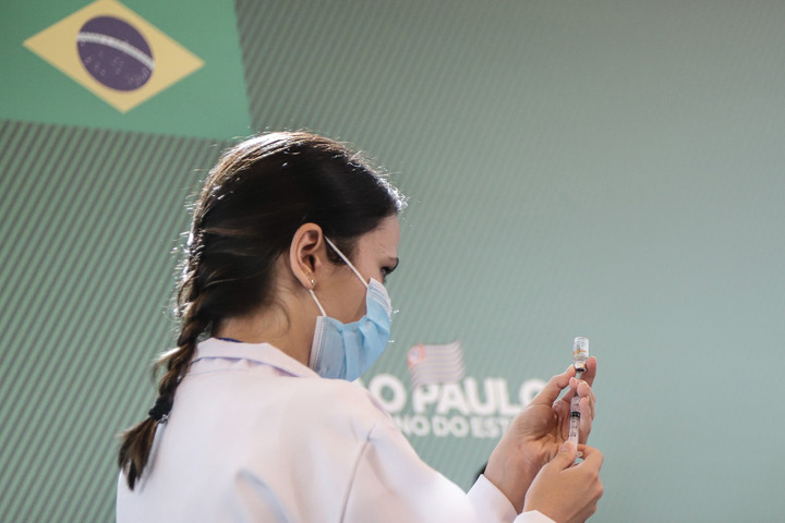 2021年1月17日,在巴西圣保羅大學臨床醫院,一名醫務人員為接種中國新冠疫苗克爾來福做準備。新華社發(拉赫爾·帕特拉索攝)