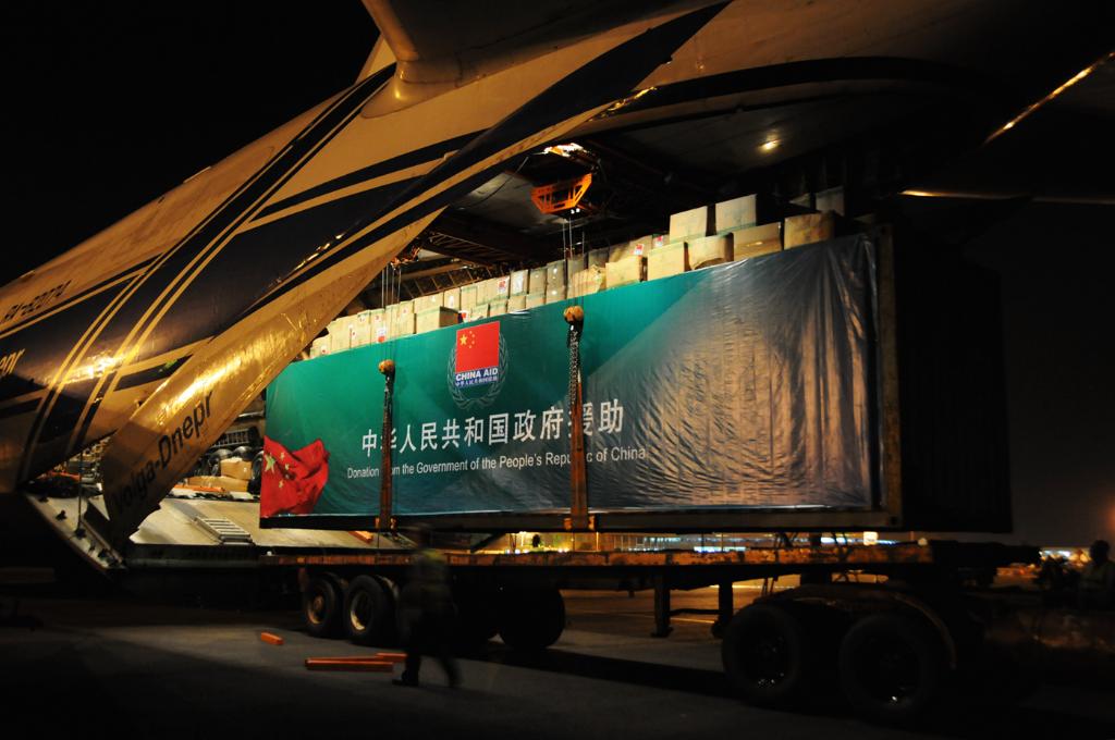 2014年10月30日,在加納首都阿克拉,工作人員卸運(yùn)剛剛抵達(dá)的中國政府援助物資。(新華社記者林曉蔚攝)