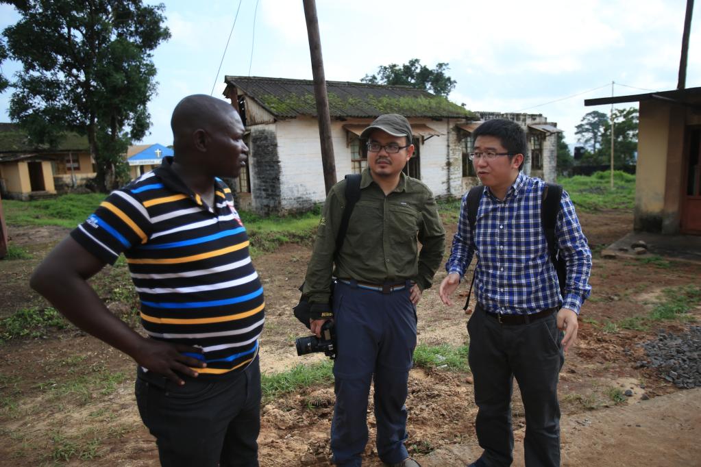 林曉蔚(中)與新華社記者李斯博(右)在塞拉利昂首都弗里敦采訪,2014年8月16日攝。(新華社記者孟晨光攝)