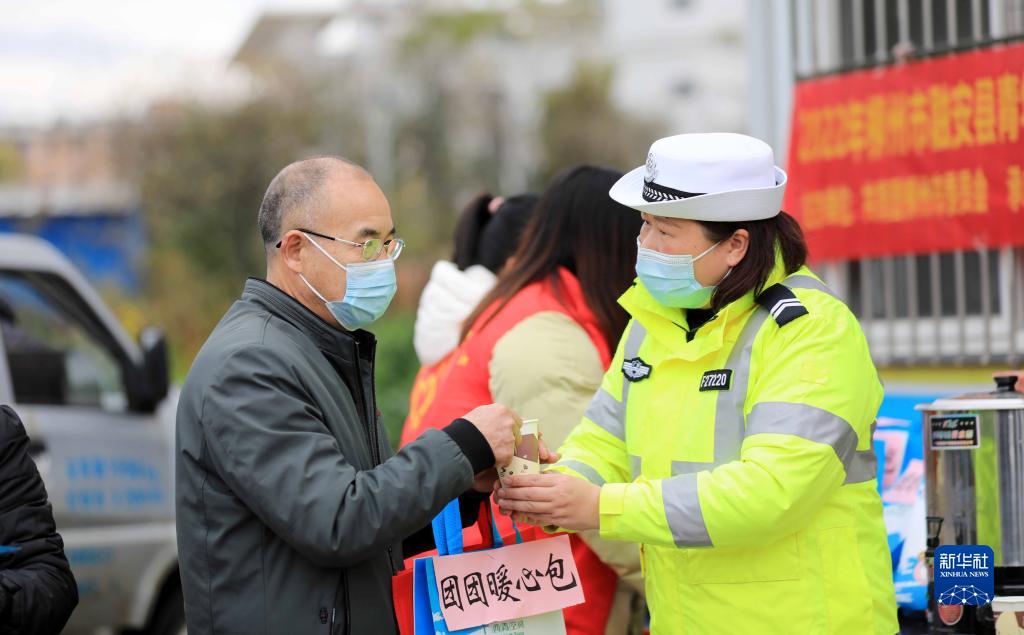 1月17日,在209國道廣西柳州市融安縣段“春運愛心驛站”,交通輔警為司乘人員送姜糖茶。新華社發(譚克興攝)