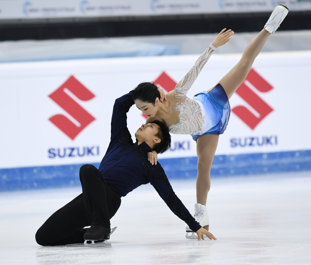 2021年11月6日,在意大利都靈舉行的2021-2022賽季花樣滑冰大獎賽意大利站雙人滑比賽中,中國選手隋文靜/韓聰奪得冠軍。新華社記者金馬夢妮攝