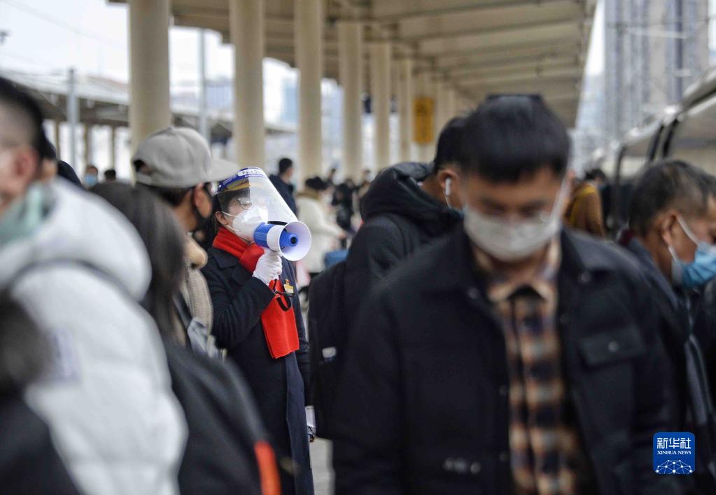 1月28日,寇莉(中)在接送過站列車。