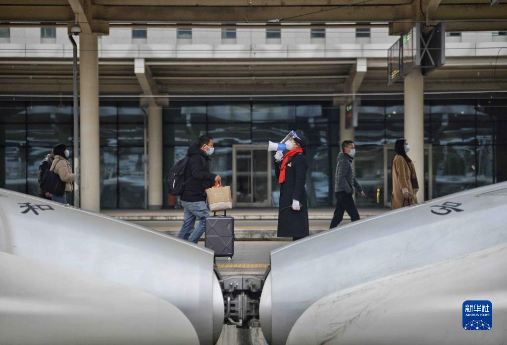 1月28日,寇莉(中)在接送過站列車。