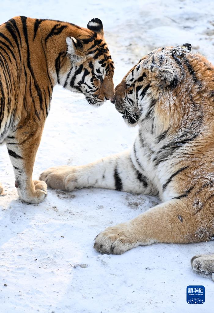 1月13日,在吉林省東北虎園內(nèi),兩只東北虎在雪地上嬉戲。