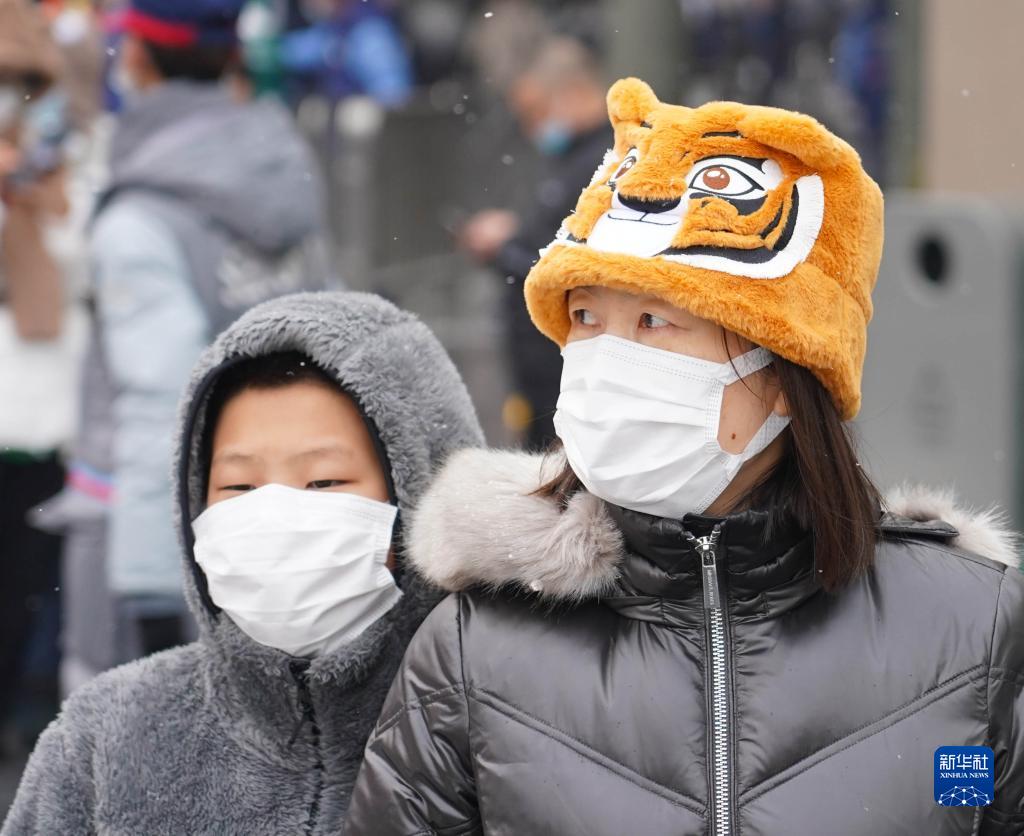 1月22日,一名戴著老虎元素帽子的女士帶著孩子在北京環球度假區內游玩。