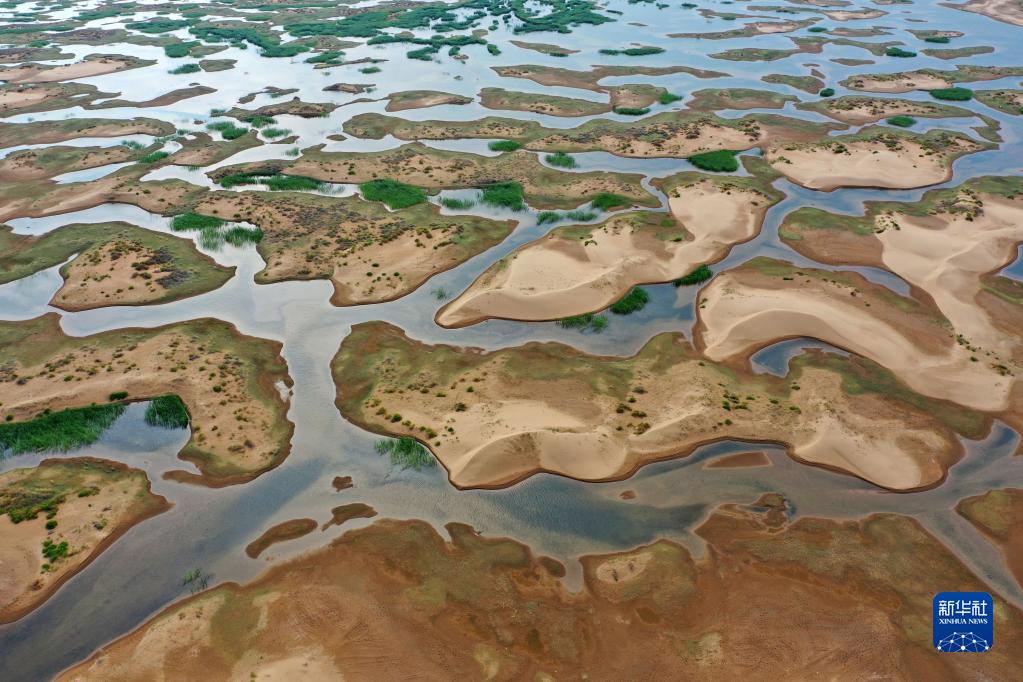 這是在內蒙古自治區鄂爾多斯市杭錦旗巴音溫都爾嘎查拍攝的庫布其沙漠濕地(2021年7月16日攝,無人機照片)。