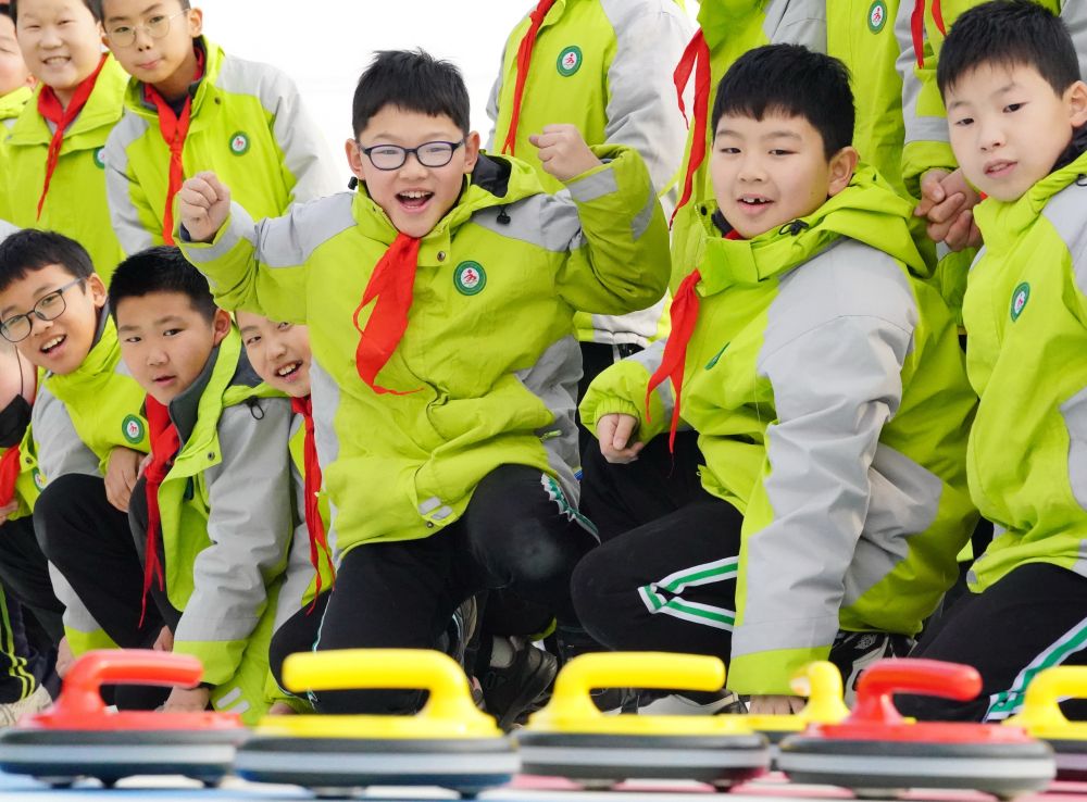 2021年12月15日,在河北省灤州市第三實驗小學,學生們在體育課上體驗旱地冰壺。新華社記者 楊世堯 攝