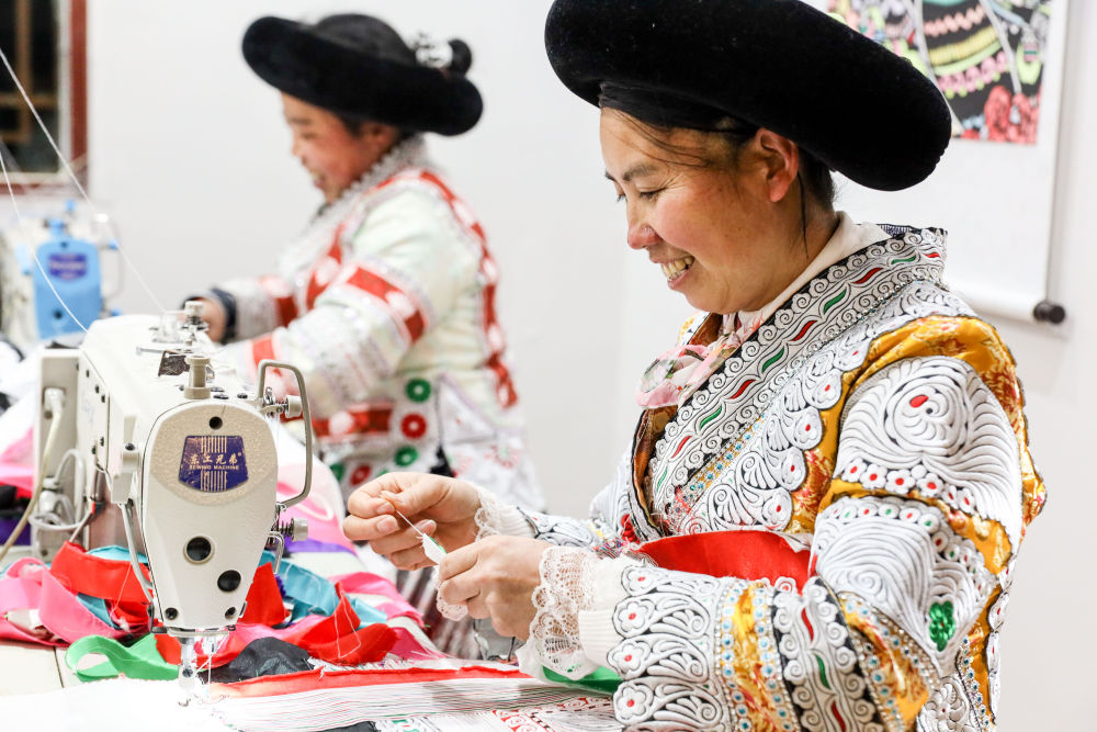 2021年2月3日,貴州畢節市黔西縣新仁苗族鄉化屋村村民在扶貧車間內加工衣服。新華社記者 歐東衢 攝