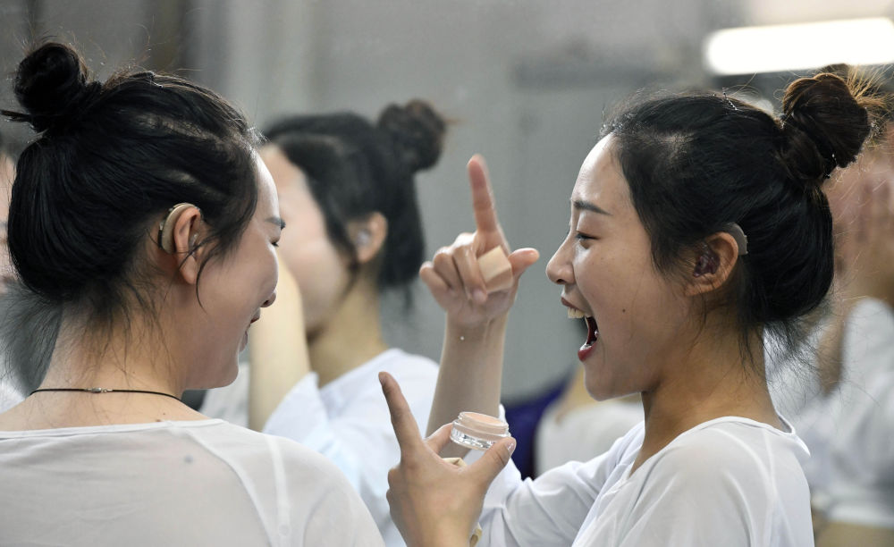 2021年5月10日,天津理工大學聾人工學院的舞蹈隊員們在學校的劇場里化妝時交流。天津理工大學聾人工學院舞蹈隊1998年成立,20余年的新老交替,一批批隊員在舞臺上收獲了認可、掌聲與贊美。新華社記者 趙子碩 攝