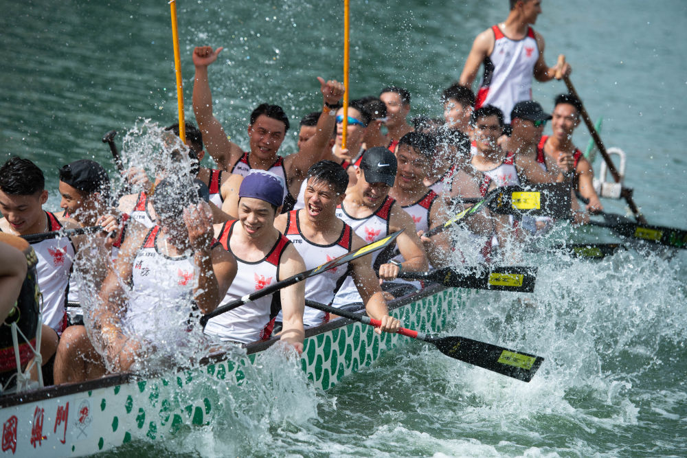 2021年6月14日,由澳門特別行政區政府體育局和中國澳門龍舟總會主辦的“2021澳門國際龍舟賽”標準龍500米公開組及女子組賽事在澳門南灣湖水上活動中心舉行,這是澳門消防局龍舟隊在標準龍500米公開組比賽后慶祝。新華社記者 張金加 攝
