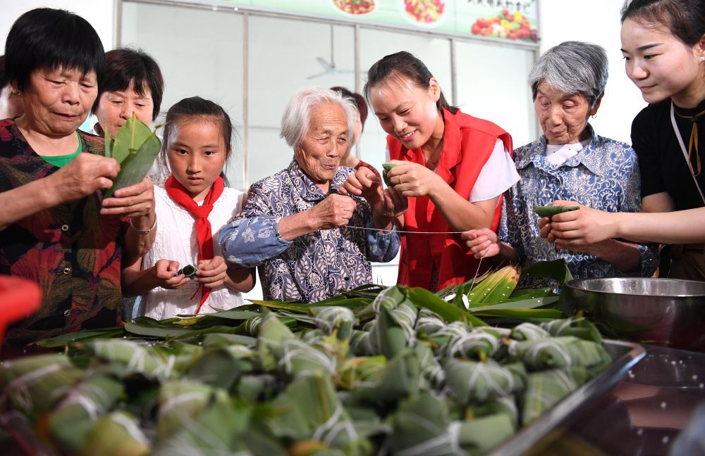 2019年6月4日 ,安徽省肥西縣上派鎮志愿者在北張養老服務中心與老人一起包粽子。新華社記者 劉軍喜 攝