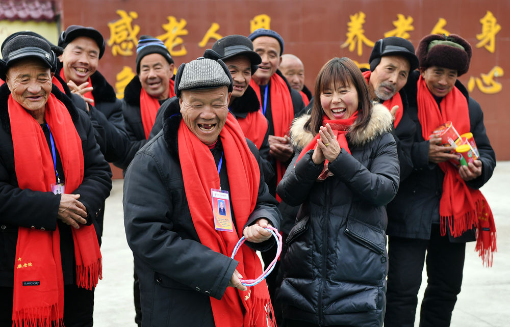 2020年1月18日?,在陜西省洛南縣靈口區域敬老院,工作人員組織老人們一起做游戲。新華社記者 陶明 攝