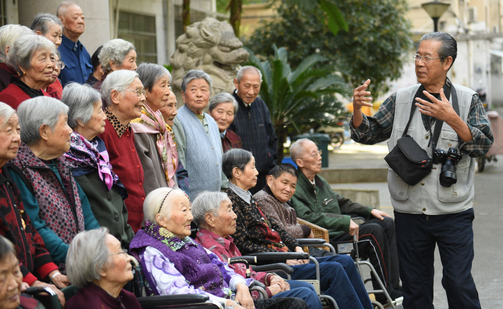 2020年10月14日,謝金聲(右)在浙江省湖州市吳興區愛山街道紅豐西塘社區老年服務中心拍合影前向老人們提示注意事項。80多歲的湖州老人謝金聲是一名攝影愛好者,從2000年開始,他每年為社區里老年公寓的老人拍一張合影。從黑白到彩色、從膠卷到數碼,他說:“希望能拍到拍不動為止。”新華社記者翁忻旸攝