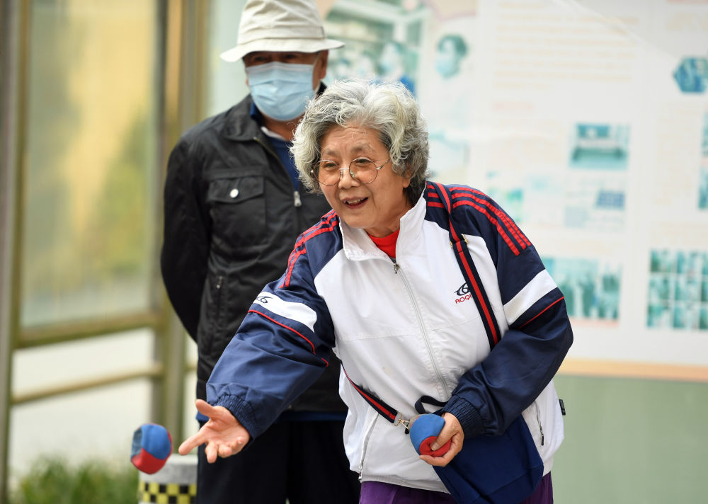 2020年10月25日,北京市海淀區北太平莊街道金暉遠洋社區舉辦“金秋十月 歡度重陽”社區居民運動會。這是社區老人羅家瑛(前)在運動會上參加“投沙包”比賽。新華社記者 任超 攝