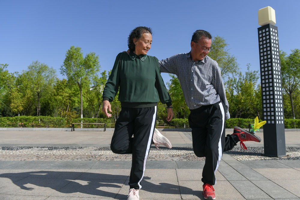2021年5月20日,張建平(右)在內蒙古自治區鄂爾多斯市新園廣場上指導老伴兒高素芬毽球動作。這對老夫妻被稱為“毽球俠侶”,只要天氣允許,老兩口就外出踢毽球,早晚各運動一小時,踢壞了幾百個毽球。新華社記者 貝赫 攝?