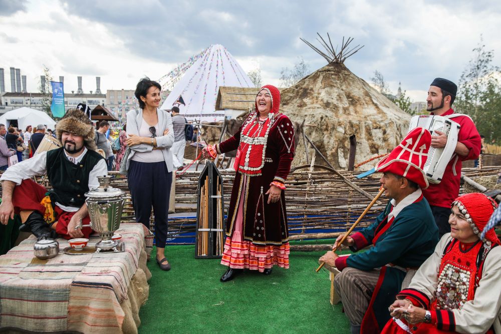 2019年9月13日,在俄羅斯首都莫斯科扎里亞杰公園,來自巴什科爾托斯坦共和國的代表在展區獻唱。新華社發(馬克西姆攝)