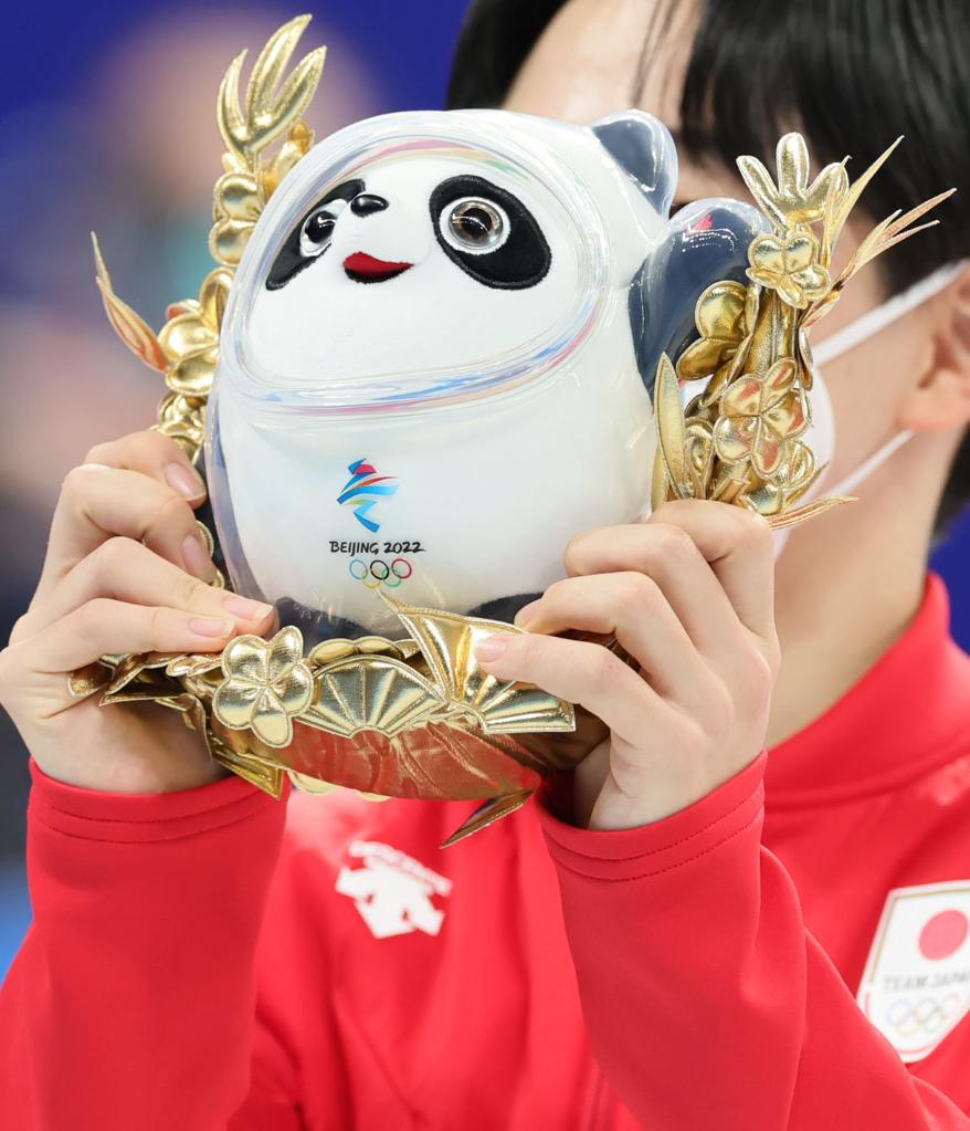 2月7日在頒發禮品儀式上拍攝的北京2022年冬奧會吉祥物“冰墩墩”。(新華社記者 蘭紅光 攝)