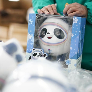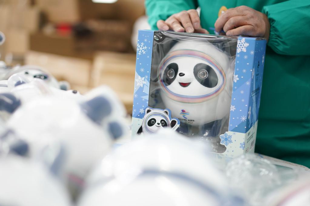2月8日,工人在特許生產商的車間里包裝“冰墩墩”。(新華社記者 季春鵬 攝)