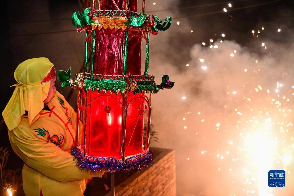 2月7日夜,龍里縣龍山鎮的村民扛著花燈參加“亮燈巡寨”活動。